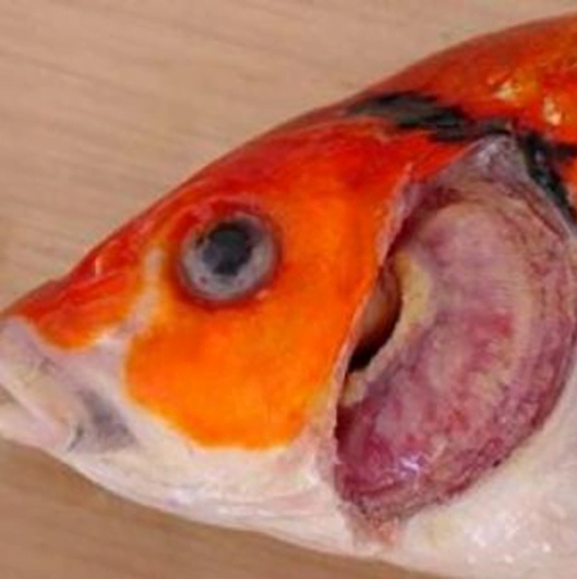 Koi dengan insang berbintik-bintik dan mata cekung akibat penyakit KHV.